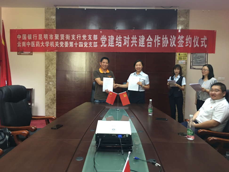 活动分四项议程进行。云南中医药大学机关党委第十四党支部与中国银行昆明市聚贤街支行党支部2020年7月起建立基层党建共建合作关系,并在海口林场在会议室开展签约仪式。双方签订了《基层党建结对共建合作协议》和《廉洁伙伴协议书》。