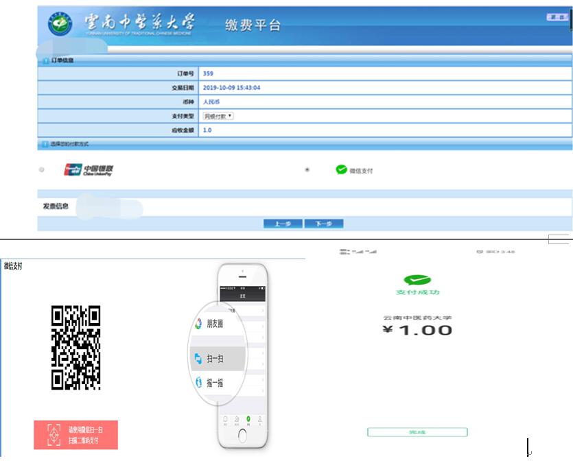 确认将要缴费项目和金额无误后,点击“支付”按钮进入网上缴费页面,系统自动生成订单号、支付时间等信息。有两种支付方式可供选择,方式一:微信支付,方式二:银联支付。