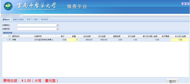 进入网上缴费系统后,选择需要缴费的项目(点击项目名称前的方框打“√”), 当需要缴纳多项缴费时,在“费用项列表”中勾选需支付的费用项,左下方会自动产生将要缴纳的费用总额,点击“支付”。