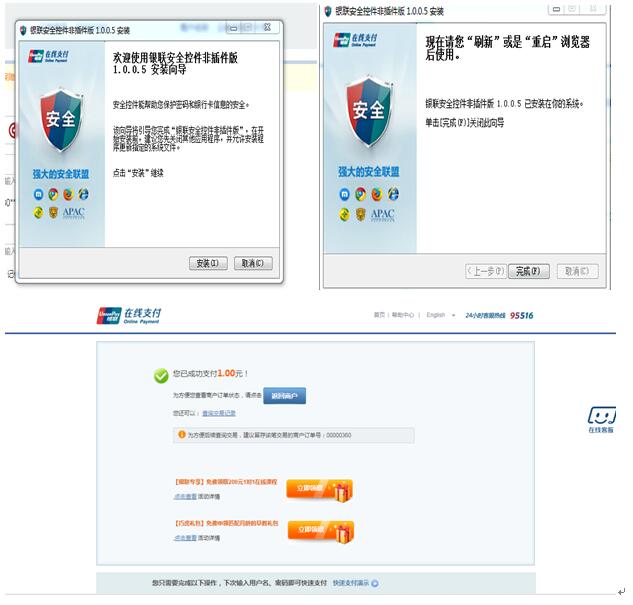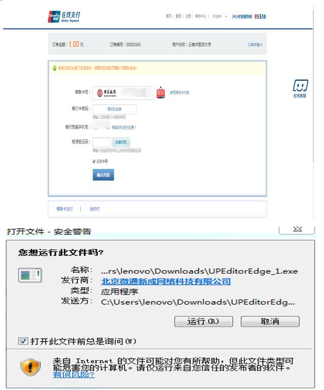 3.首次支付的同学需要在“银行卡密码”处点击“请点此安装”,安装“银联安全控件非插件版”,点击“运行”→“安装”,安装成功后返回支付界面→刷新,输入银联支付密码,手机号,获取短信验证码,点击“确认支付”。