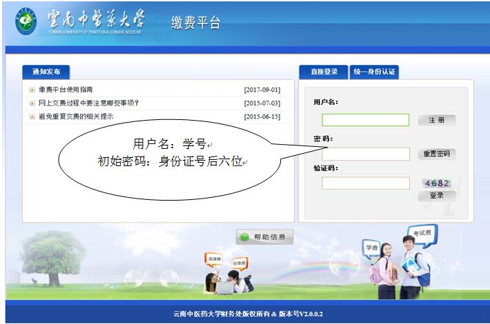 1.密码遗忘的、使用中有困难的,可到计财处收费管理科(呈贡校区崇德楼211室)联系解决,电话:0871-65918180。